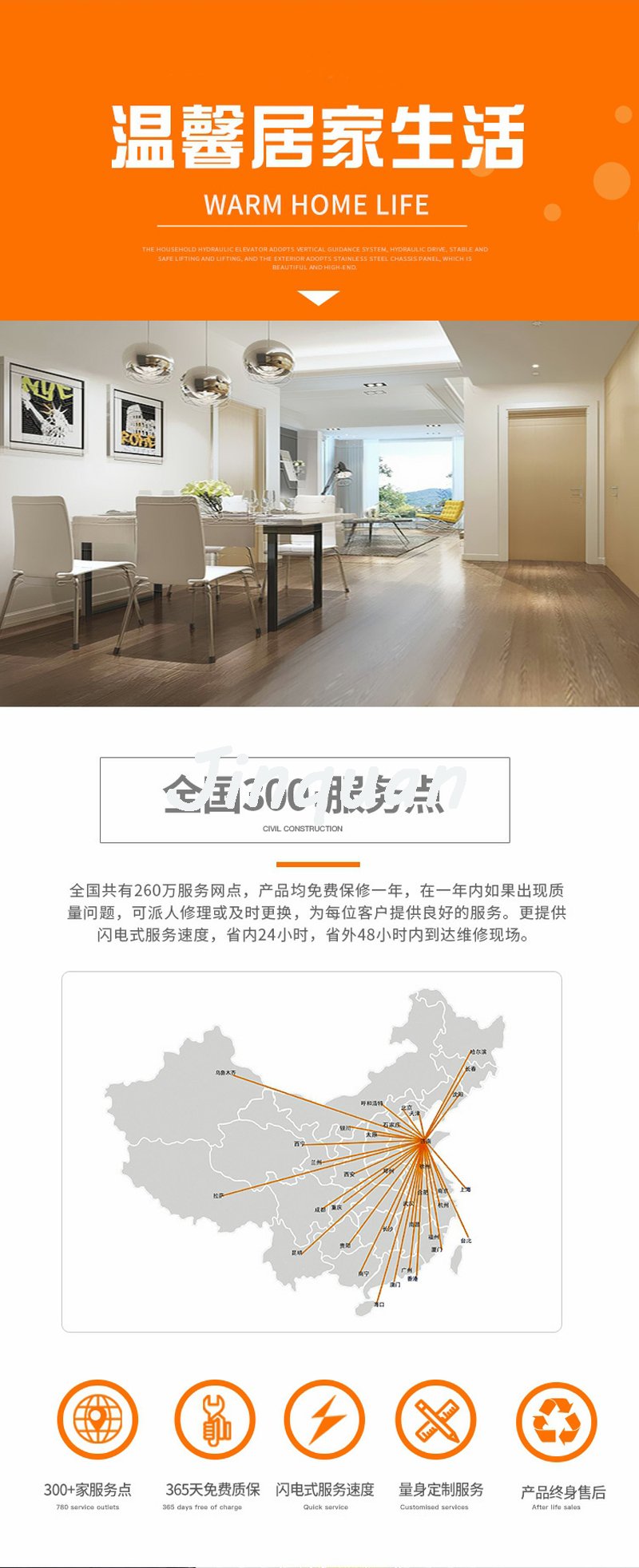 家用電梯,提供十二個月的質保期。在質保期內,如電梯出現故障,我們的專業維保人員會在二十四小時內趕到現場,免費進行維修保養。質保期外或質保期內屬人為操作不當導致的故障,我們也將在二十四小時內趕到現場,我們僅僅收取一點適當的成本費。