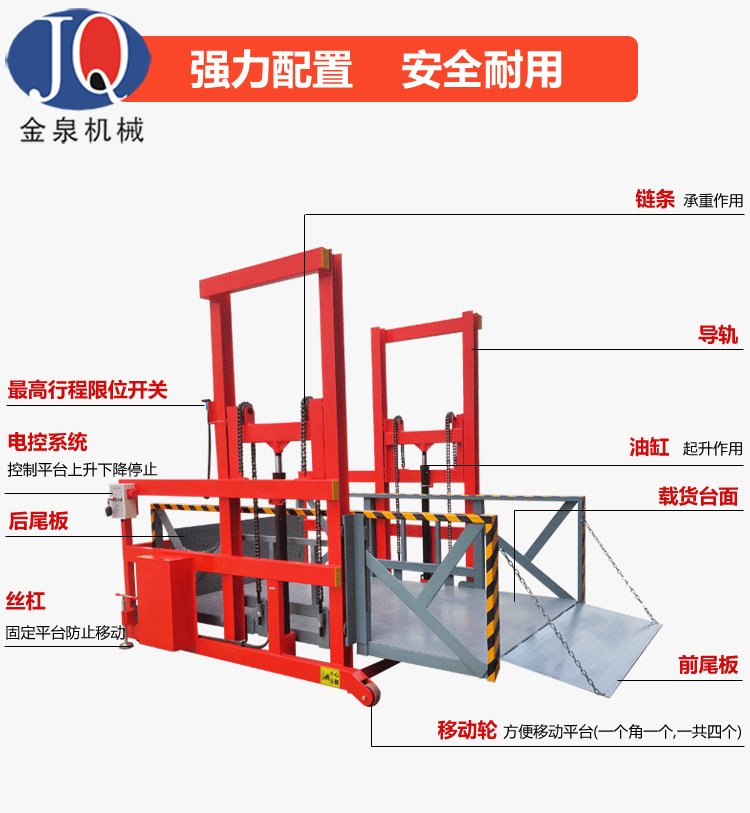 5. 本登車橋嚴(yán)禁人貨載,貨物裝上平臺(tái)后掛上防護(hù)鏈條,工作人員應(yīng)站立于地面控制平臺(tái)升降作業(yè)。